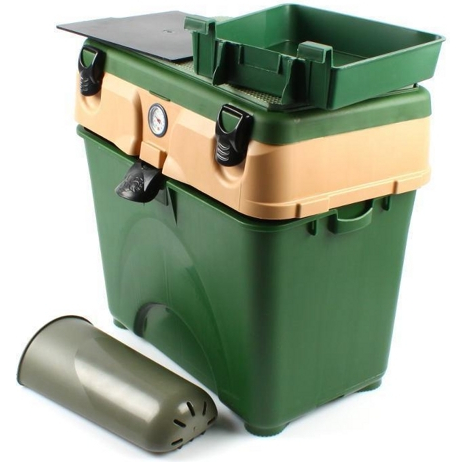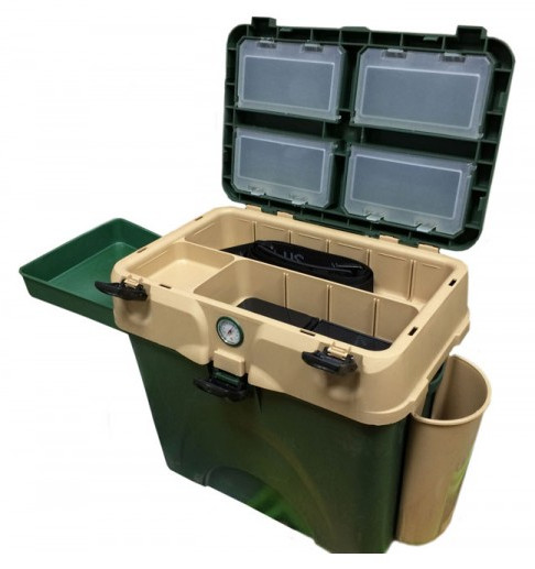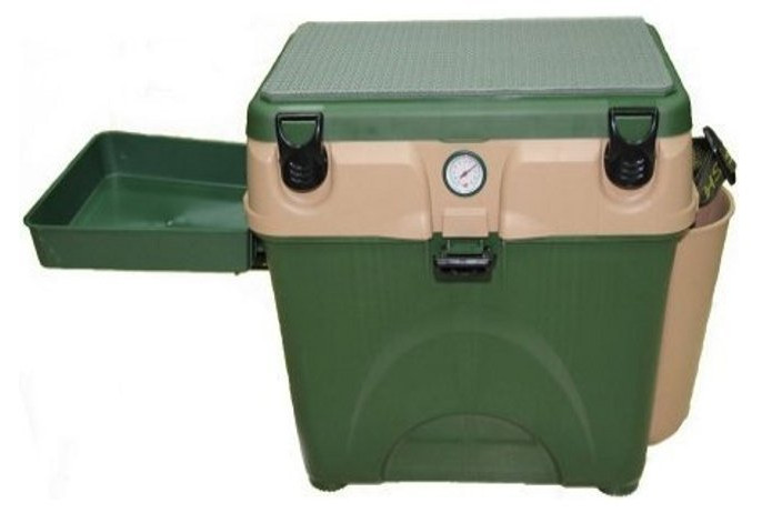 Удобный ящик для зимней рыбалки со встроенным термометром. Изготовлен из морозоустойчивого пластика. Комплектуется навесным стаканом и лотком-столиком. В крышке ящика предусмотрены четыре отделения с прозрачными крышками для мелких принадлежностей. Среднее отделение ящика имеет съемные перегородки для более удобного хранения принадлежностей. Большое отделение также имеет съёмную перегородку. Пластина из пенополиэтелена на крышке ящика не впитывает влагу и обеспечивает комфортное сидение. Изделие комплектуется регулируемым плечевым ремнем.