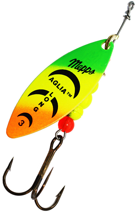 Дальние забросы, простота анимации и уверенная работа даже при проводке против течения - особенности вращалок серии Aglia Long 3. Разработчики Mepps наделили приманку длинным лепестком, который напоминает листик ивы. Этот элемент вращается с первой потяжки без сбоев на спокойных и быстрых проводках. Разделенный поперечным рифлением на несколько шарообразных частей сердечник стабилизирует приманку, улучшает полетные характеристики. Модель весит 11,5 гр. Подойдет для облавливания с одного места больших площадей на глубоких акваториях. Дразнящая игра Aglia Long 3 приманит и разных лососевых, включая форель, и осторожного голавля и жереха, а также окуня и щуку.