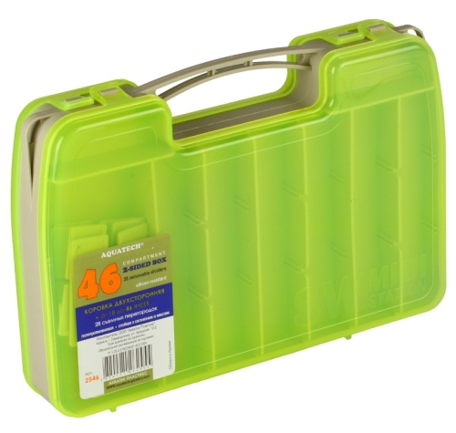 Коробка Aquatech 2546 - двухсторонняя пластиковая коробка предназначена для хранения мелкой оснастки, крючков, мормышек, мушек, изготовлена из полипропилена, устойчивого к воздействию масел, многих растворителей и силиконов. Коробка может быть разделена на 18-46 ячеек при помощи 28 перегородок. Коробка имеет ручку для переноски и ушки для ношения на нашейной тесьме, что очень удобно при ловле на спиннинг.