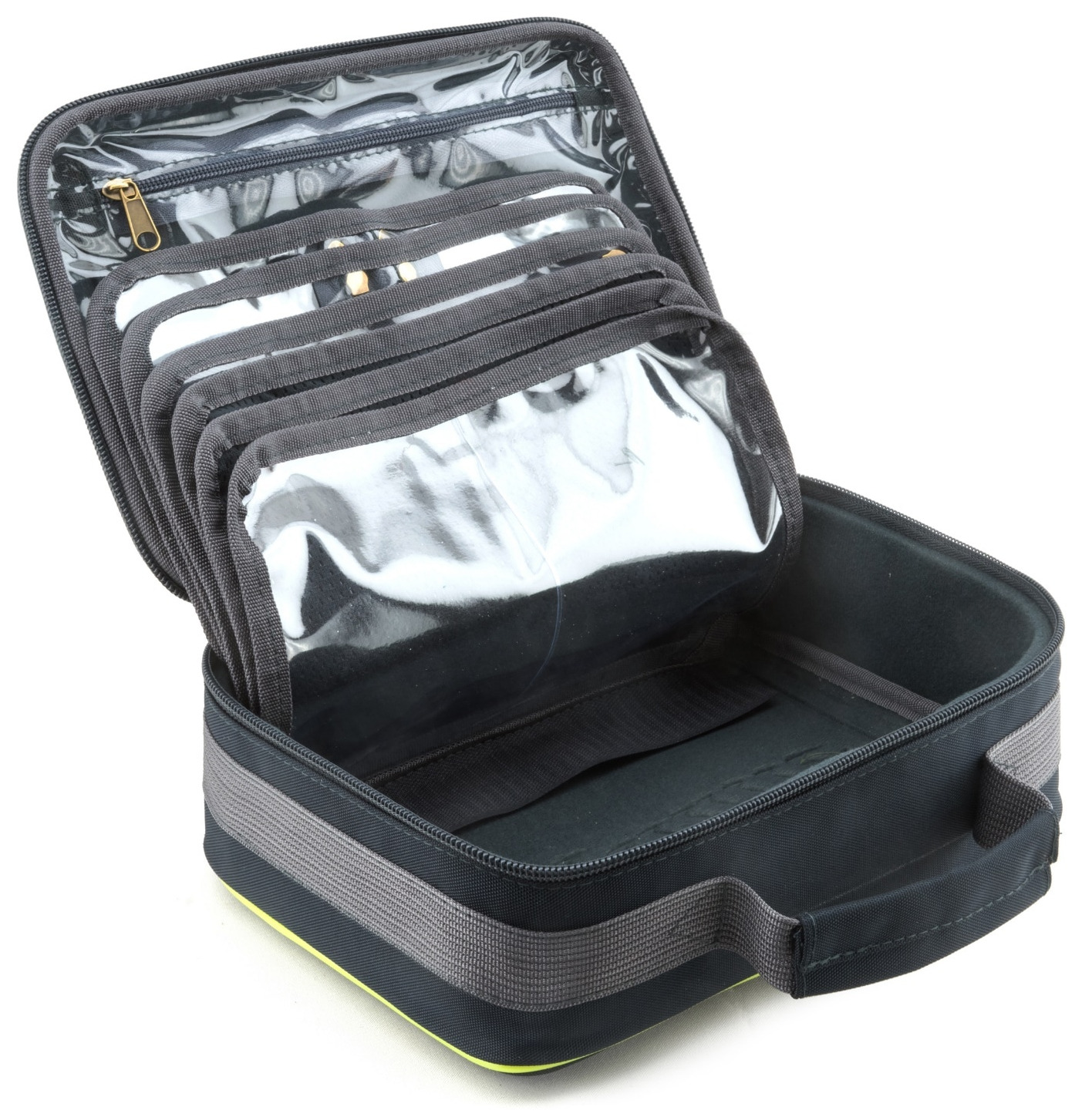 Сумка С-41 с 6 отделениями из ПВХ для готовых карповых оснасток. Для удобства использования отделения выполнены в виде съемного блока, который крепится внутри кейса с помощью липучки, а в случае необходимости легко снимается для более комфортной работы с оснастками во время рыбалки. На крышке расположен дополнительный карман из ПВХ на молнии.
