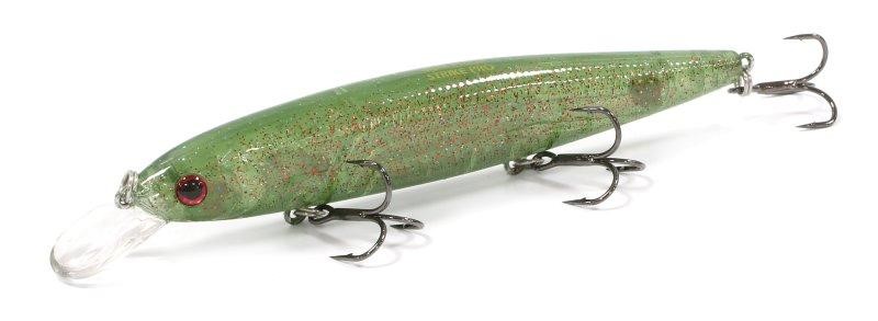 Воблер типа "minnow" Bold 110SP имеет длинное веретенообразное, при этом довольно упитанное тело и оснащен тремя мощными тройниками Owner. Минноу имеет интересную систему огрузки. Передний шарик расположен в голове приманки и может передвигаться от одной жаберной крышки к другой. В следующем отделении расположены пять мелких металлических шариков, выполняющих роль высокочастотной погремушки. Сразу за передним тройником есть тяжелый шарик, который отвечает за дальность заброса. За центральным тройником есть стационарная подгрузка, которая улучшает поведение приманки при твичинге. На равномерной проводке воблер демонстрирует красивую устойчивую игру с осевыми доворотами корпуса. На проводке стоп-энд-гоу при каждой паузе воблер продолжает интенсивно покачивать боками. Самым эффективным Bold 110SP является для ловли щуки.