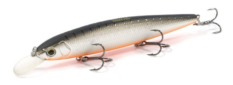 Воблер типа "minnow" Bold 110SP имеет длинное веретенообразное, при этом довольно упитанное тело и оснащен тремя мощными тройниками Owner. Минноу имеет интересную систему огрузки. Передний шарик расположен в голове приманки и может передвигаться от одной жаберной крышки к другой. В следующем отделении расположены пять мелких металлических шариков, выполняющих роль высокочастотной погремушки. Сразу за передним тройником есть тяжелый шарик, который отвечает за дальность заброса. За центральным тройником есть стационарная подгрузка, которая улучшает поведение приманки при твичинге. На равномерной проводке воблер демонстрирует красивую устойчивую игру с осевыми доворотами корпуса. На проводке стоп-энд-гоу при каждой паузе воблер продолжает интенсивно покачивать боками. Самым эффективным Bold 110SP является для ловли щуки.