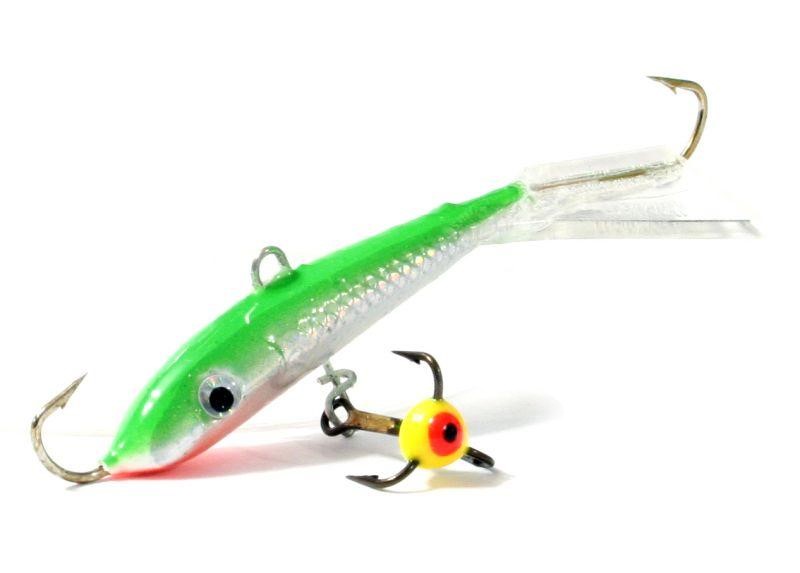 В линейке медленно планирующих и реалистичных балансиров Fin есть модель, рассчитанная на довольно крупную добычу. Габариты приманки чуть больше 7 см, вес - 19 гр. Однако стоит заметить, что размеры хвоста - почти 2 см, потому прозрачный плавник-стабилизатор визуально уменьшает габариты приманки, окрашенный - увеличивает. Эксперты Lucky John наделили Fin 5 уплощенным брюшком, потому балансир погружается неспешно. А благодаря хвосту, двигается со значительной амплитудой, чтобы обловить большее пространство. Имитирующая малька приманка с "живыми" глазками приманит даже тех хищников, что находятся в некотором отдалении от лунки. Оборудован, кроме впаянных одинарников, балансир Fin 5 тройником с разноцветной, яркой каплей. Дразнящий элемент служит дополнительной точкой для атаки. Тройник крепится на застежке, при риске зацепов его легко снять. Приманка своей соблазнительной игрой спровоцирует на поклевку даже заторможенную щуку, судака или горбача-окуня.
