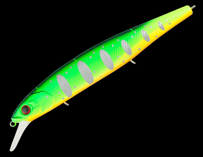 Tsu Yoki Flirt 128SP - Big minnow с нейтральной плавучести для ловли на глубинах 2.0 - 3.0 метров. При работе с FLIRT 128SP нужно использовать весь арсенал проводок, от равномерной до рывковой. На равномерной проводке воблер имеет очень приятную широкоамплитудную, и при этом низкочастотную собственную игру. При использовании стоп энд гоу (протяжка с с паузой или несколько оборотов катушки с паузой) воблер в паузе медленно всплывает, немного покачиваясь. На самой протяжке бликует и немного показывает бока. На рывковой анимации FLIRT 128SP ведет себя очень отзывчиво и послушно. Если анимировать его короткими, но достаточно резкими рывками, то воблер разворачивается на 90+ градусов практически на месте, в момент самого рывка активно показывает бока. FLIRT 128SP отличный воблер для охоты за щукой над коряжниками и кормовыми поливами.