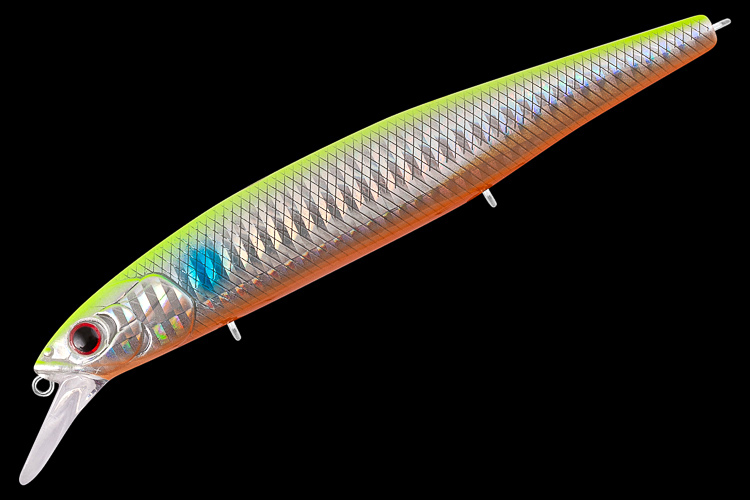 Tsu Yoki Flirt 128SP - Big minnow с нейтральной плавучести для ловли на глубинах 2.0 - 3.0 метров. При работе с FLIRT 128SP нужно использовать весь арсенал проводок, от равномерной до рывковой. На равномерной проводке воблер имеет очень приятную широкоамплитудную, и при этом низкочастотную собственную игру. При использовании стоп энд гоу (протяжка с с паузой или несколько оборотов катушки с паузой) воблер в паузе медленно всплывает, немного покачиваясь. На самой протяжке бликует и немного показывает бока. На рывковой анимации FLIRT 128SP ведет себя очень отзывчиво и послушно. Если анимировать его короткими, но достаточно резкими рывками, то воблер разворачивается на 90+ градусов практически на месте, в момент самого рывка активно показывает бока. FLIRT 128SP отличный воблер для охоты за щукой над коряжниками и кормовыми поливами.