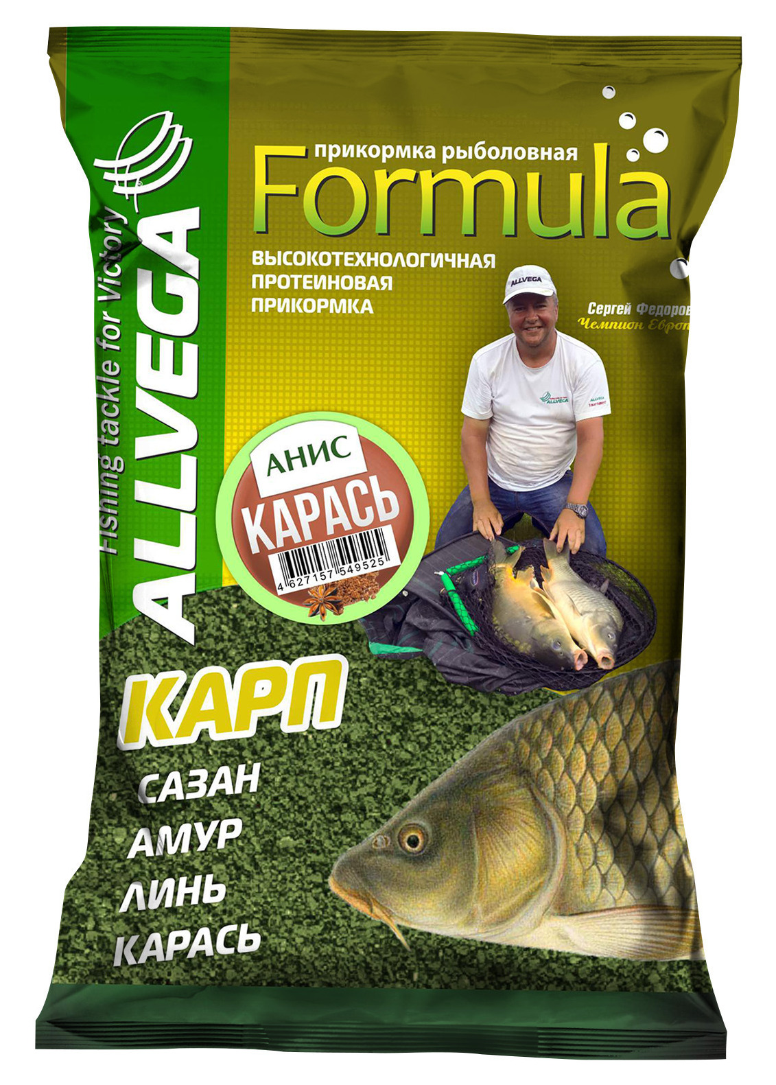 Светло-зеленая прикормка с анисовым ароматом. Состоит из частиц средней и мелкой фракции с добавлением злаковых масленичных культур. Физические свойства прикормки позволяют привлечь карася с расстояния, а аромат и питательные свойства, удержать его в месте ловли.