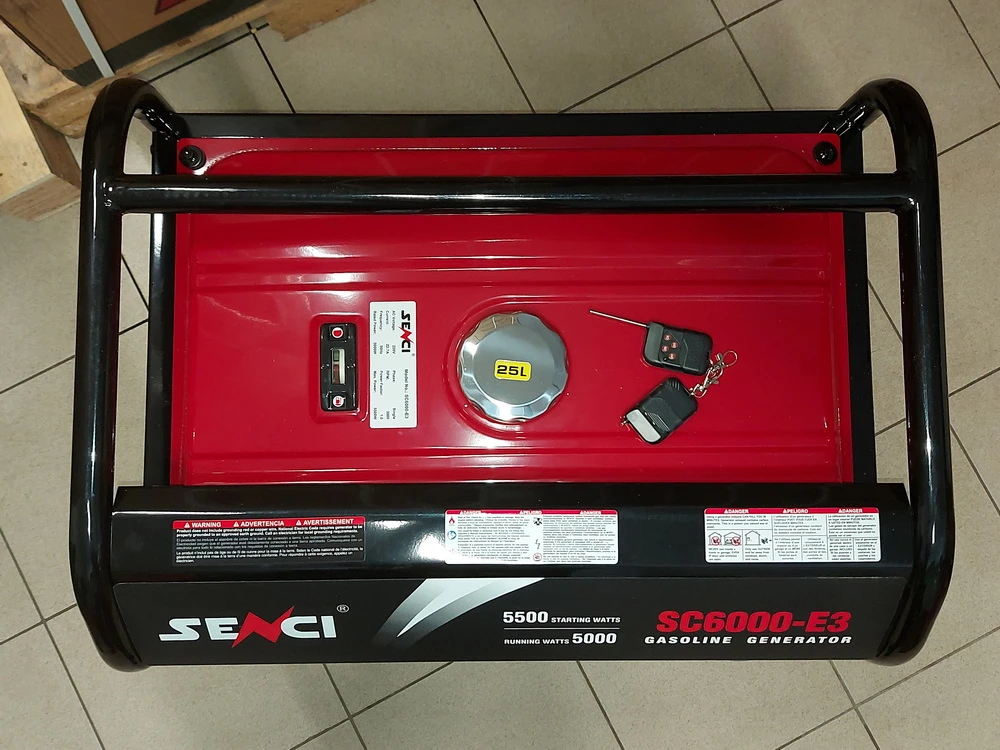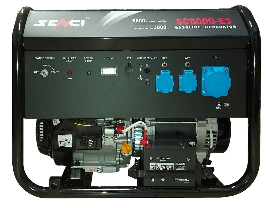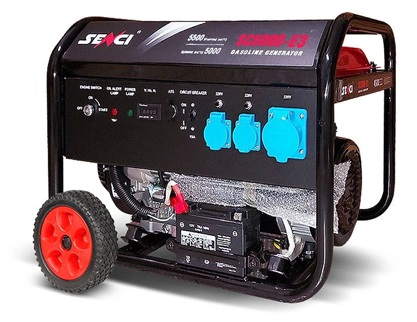 Генератор бензиновый Senci SC6000-E3. Передвижной однофазный бензогенератор мощностью 5 кВт можно использовать в качестве резервного источника электропитания при производстве отдаленных строительных работ, а также для питания торговых точек и поддержания электричества в жилом доме.