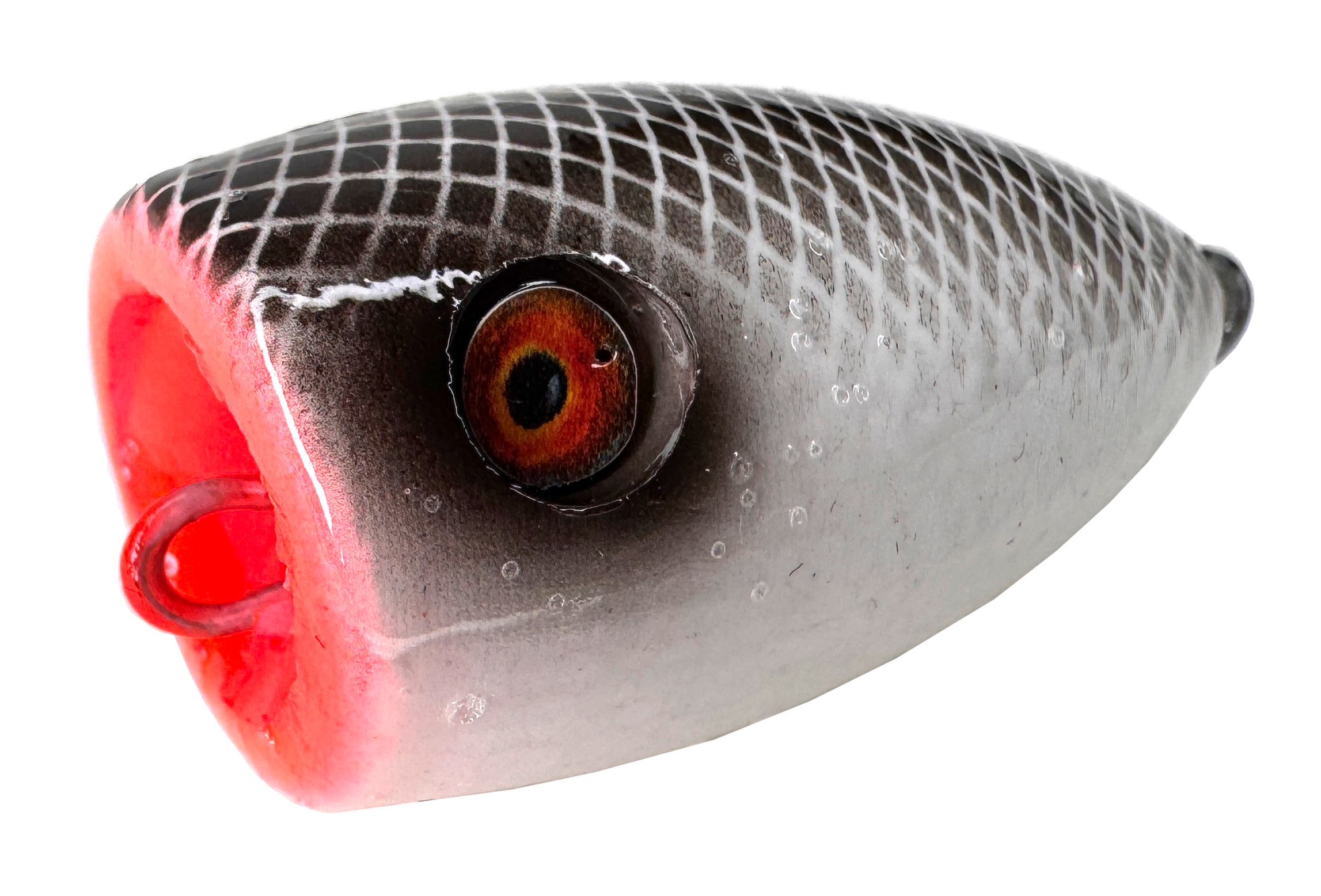 Особенностью этого поппера является минимальный размер и наличие вместо тройного крючка, имитации личинки на коротком поводке. Как раз эта имитация личинки (нимфа) дополнительно привлекает рыбу, которая подходит на звук поппера.