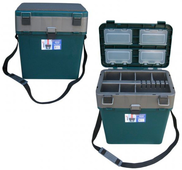 Ящик зимний позволит аккуратно хранить рыболовные принадлежности. В нижнем отделении можно хранить удочки, рыбу, одежду и другие крупные аксессуары для зимней ловли. В крышке ящика есть несколько отделений для хранения мелочей. В комплекте к зимнему ящику идет широкий ремешок для удобной транспортировки ящика на льду.