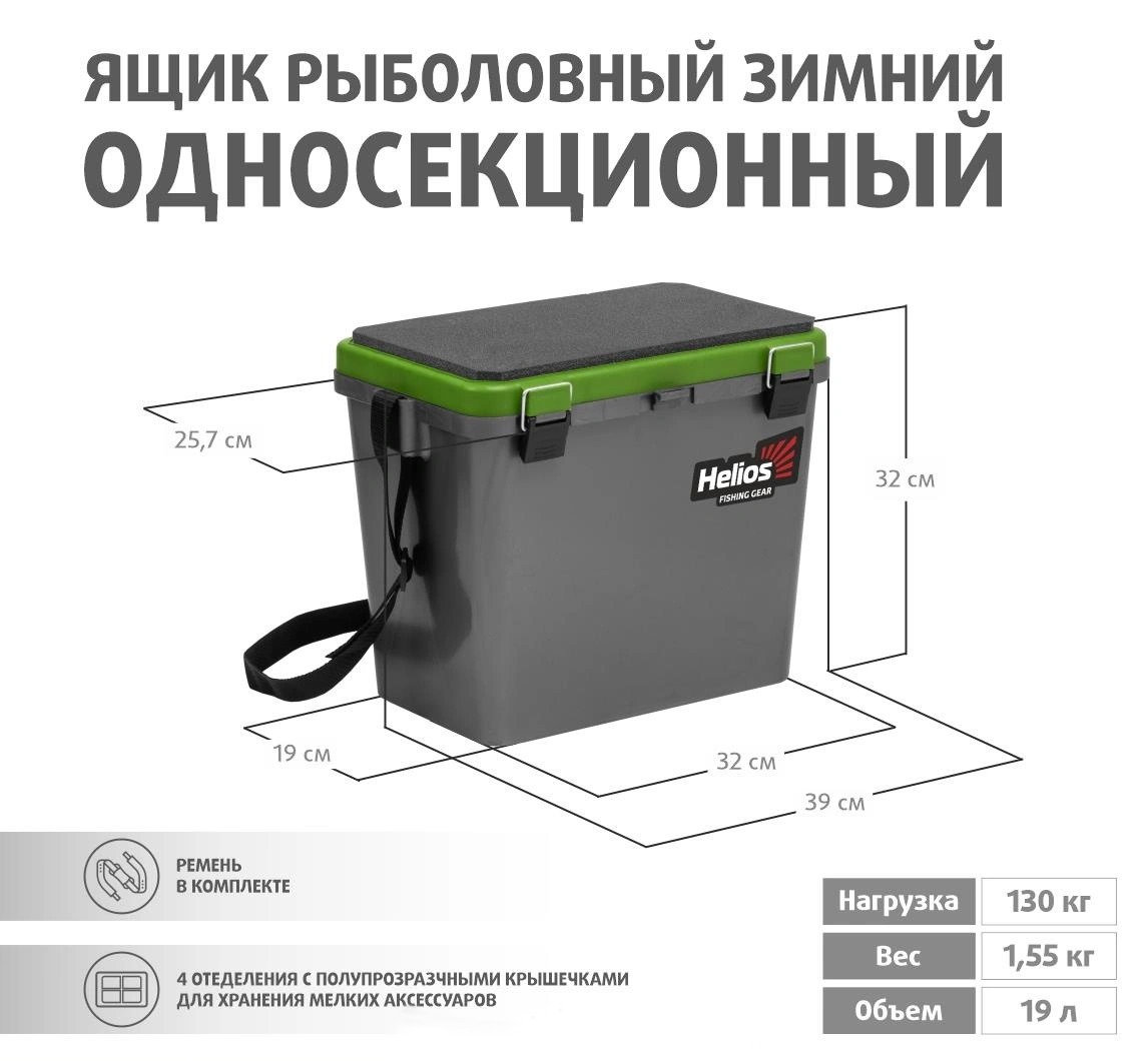 Ящик рыболовный зимний односекционный торговой марки Helios, изготовленный из ударопрочного, морозостойкого и в то же время легкого пластика, обеспечивает надежное хранение и транспортировку рыболовных снастей. Благодаря объему 19 литров, ящик вместит очень много полезных снастей для рыбалки.