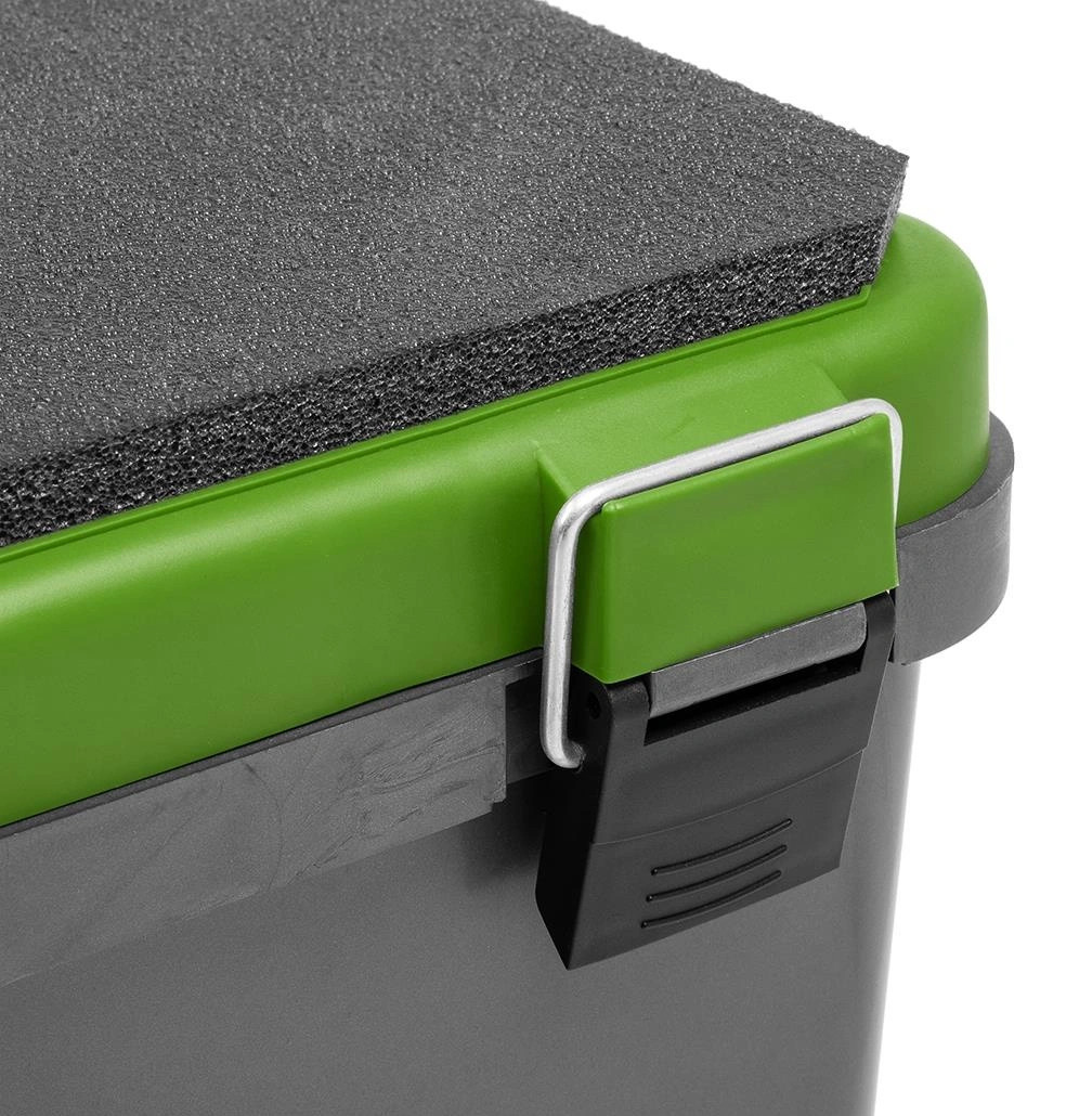 Мягкое незамерзающее сиденье на крышке ящика, аккумулирующее тепло, позволит рыболову комфортно рыбачить с ящика долгое время.