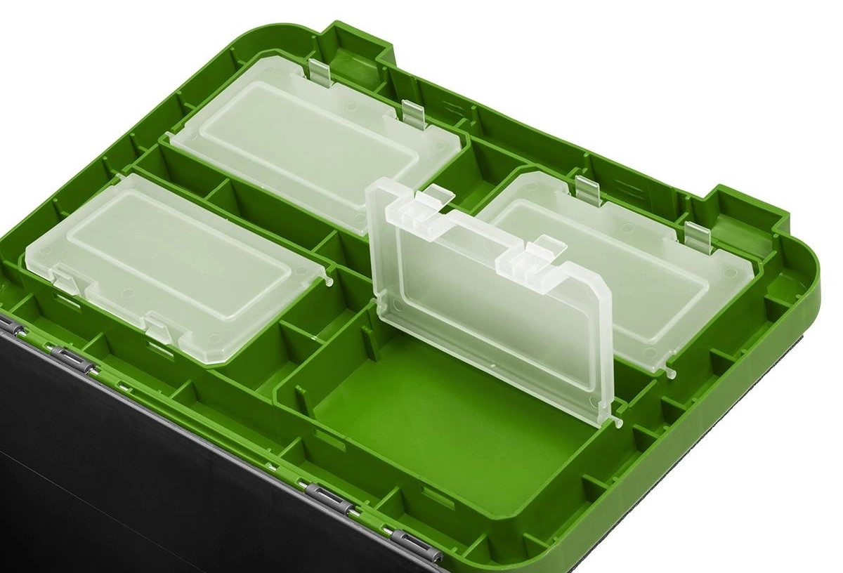 Основной отсек предназначен для переноски рыболовных снастей, термоса, так же удобен для перевозки улова. На внутренней стороне крышки размещены 4 отеделения с полупрозразчными крышечками для хранения мелких аксессуаров.