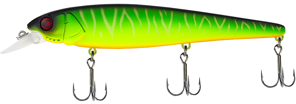 Воблер Jackall Jockie 120– это не совсем обычная приманка, и все благодаря ее поведению на поверхности. Эта особенность проявляется в придании воблера вертикального положения, с кверху торчащей мордочкой. Кроме того, лопасть имеет свойство создавать хлюпающий звук, почти как у поппера, стоит только начать движение. Эти рывки по приданию приманки ускорения заглубляет воблер, но не глубоко, до 30 см. Приманка достаточно объемна, и пригодится в тех случаях, когда крупные экземпляры рыб охотятся у поверхности. Зафиксировать контакт с рыбой призваны целых три тройника, благо удлиненное тело позволяет гармонично разместить эти острые фиксаторы. Окунь и щука – это наиболее популярные контактеры с данной моделью приманки.