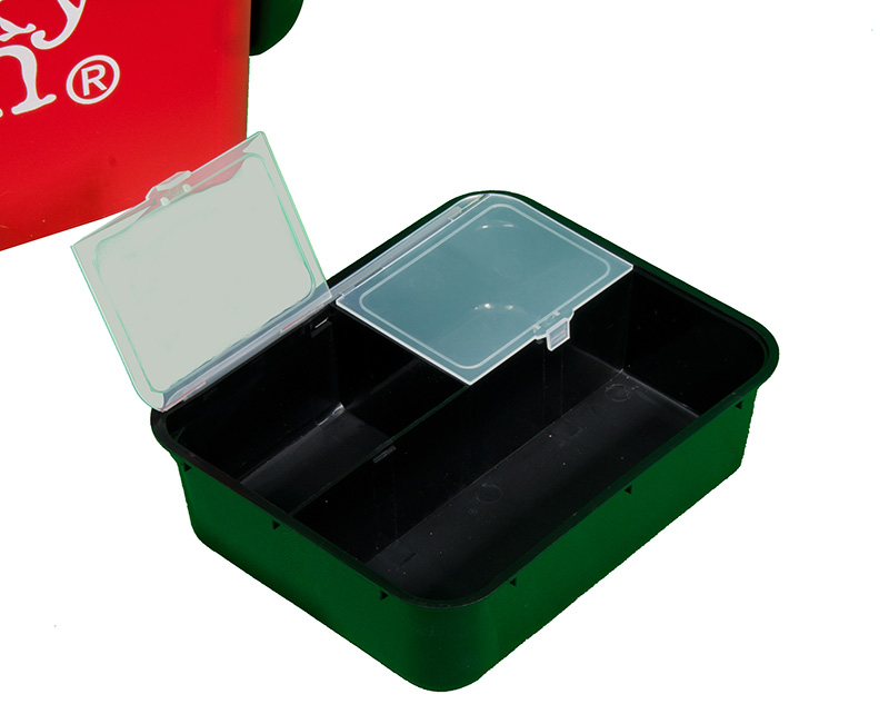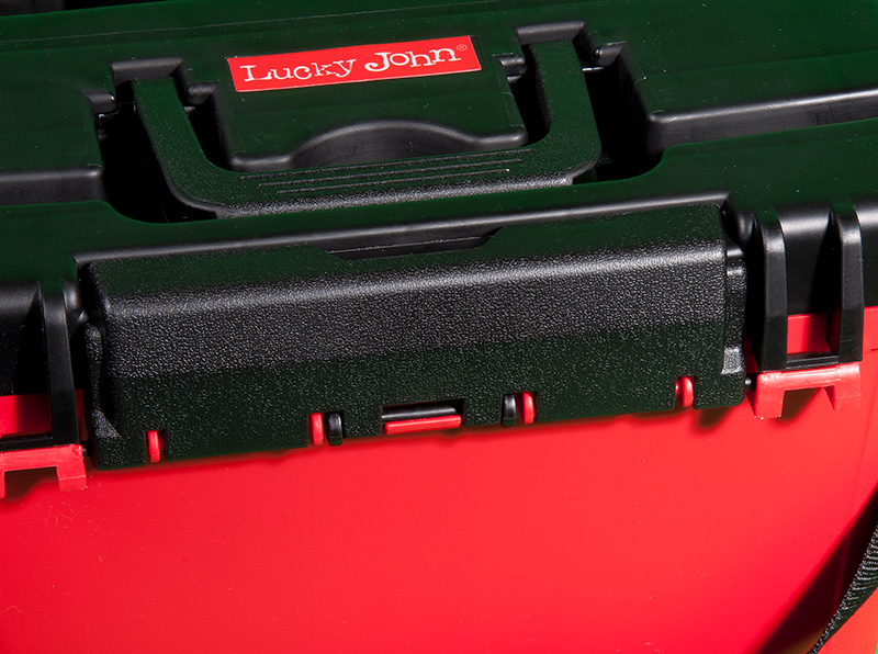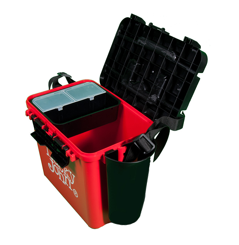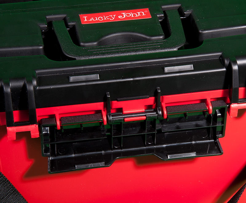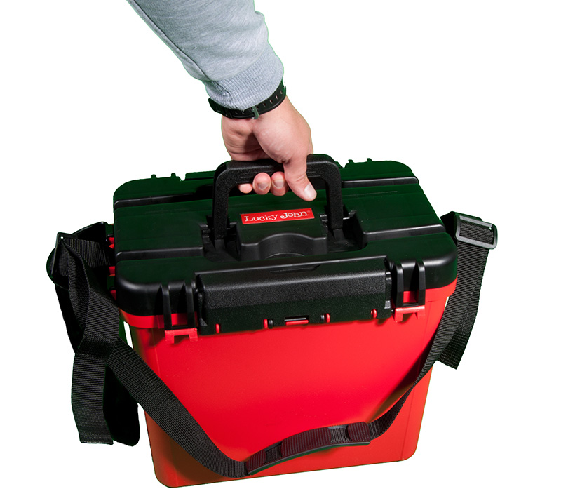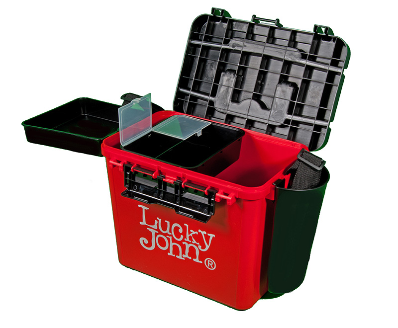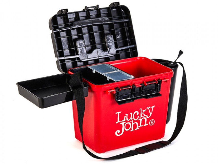 Представленный здесь ящик Lucky John можно использовать зимой и летом. Он легкий и прочный. Благодаря компактным габаритам, без труда помещается в рыболовные санки. Переносить его можно и на плече (ремень идет в комплекте). На крышке есть линейка для измерения улова. Отделение в ящике одно, оно герметичное и легко моется. В нем можно без проблем переносить рыбу. Полезное пространство можно увеличить с помощью навесного пластикового стакана и столика в виде глубокого лотка. Для удобства застежки на крышке есть с двух сторон.
