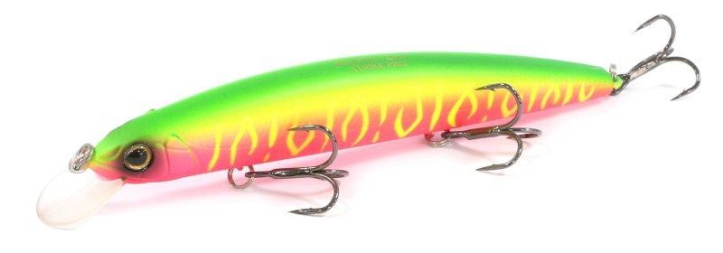 Здесь представлен прогонистый изящный минноу из серии Montero 110SP. Корпус длиной 11 см скрывает в себе сложную систему огрузки. Во-первых, внутри расположен продольный изогнутый канал. По нему перекатываются два шарика, чтобы увеличить расстояние, на которое можно забросить приманку. Во-вторых, под этим каналом расположена отдельная камера с шариком, который отвечает за шумовой эффект. В-третьих, ближе к головной части и между средним и хвостовым тройником есть две стационарные пластины. Они прижаты к брюшку, потому минноу Strike Pro серии Montero 110SP показывают выраженный, четкий роллинг. Продольные колебания сохраняются некоторое время при перерыве в проводке. Приманка будет соблазнительно играть на равномерке. Зависать неподвижно на заданном горизонте при паузе в Stop & Go, чтобы вывести из себя даже неактивную рыбу. Однако минноу в первую очередь рассчитан на любые виды твича.