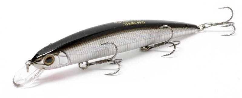 Приманкой высшего класса можно смело назвать воблер типа minnow от компании Strike Pro Montero 130SP. Все в этой приманке на самом высоком уровне: рабочие характеристики, уловистость, покраска, качественные фурнитура и материалы. Воблер будет актуален при облове мелководья и при ловле пассивной хищной рыбы в холодной воде. Внутри приманки расположены три шарика, которые положительно влияют на дальность заброса. На равномерной проводке Montero начинает играть уже на небольших скоростях и обладает отличным роллингом, сверкает оттенками брусковатого тела. При твичинговой проводке приманка очень отзывчивая и позволяет выполнять различные вариации проводок с большим диапазоном отклонений воблера от направления рывка.