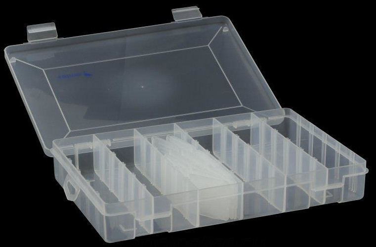 Средняя односторонняя коробочка с отсеками для хранения рыболовных мелочей. Комплектуется 15-ю съемными разделителями.