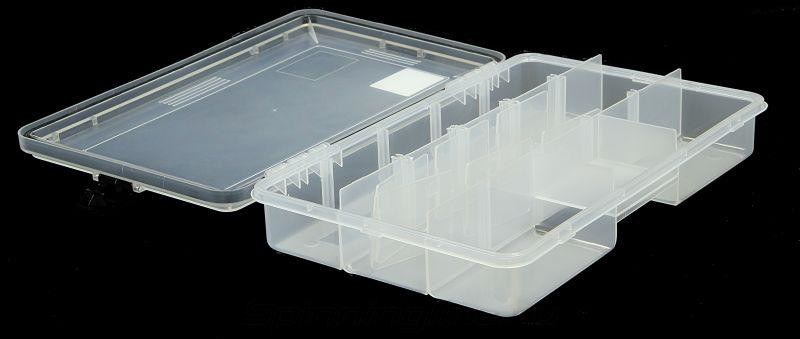 Надежная коробка из прозрачного пластика для хранения различных рыболовных принадлежностей. Кейс имеет 2 не регулируемых отсека. В комплекте поставляются 6 перегородок для регулируемых отсеков. С помощью них возможно подстроить длину отделений под определенные нужды. Для предотвращения самопроизвольного открытия коробки производитель снабдил ее 2-мя лицевыми и 2-мя торцевыми надежными пластиковыми замками.