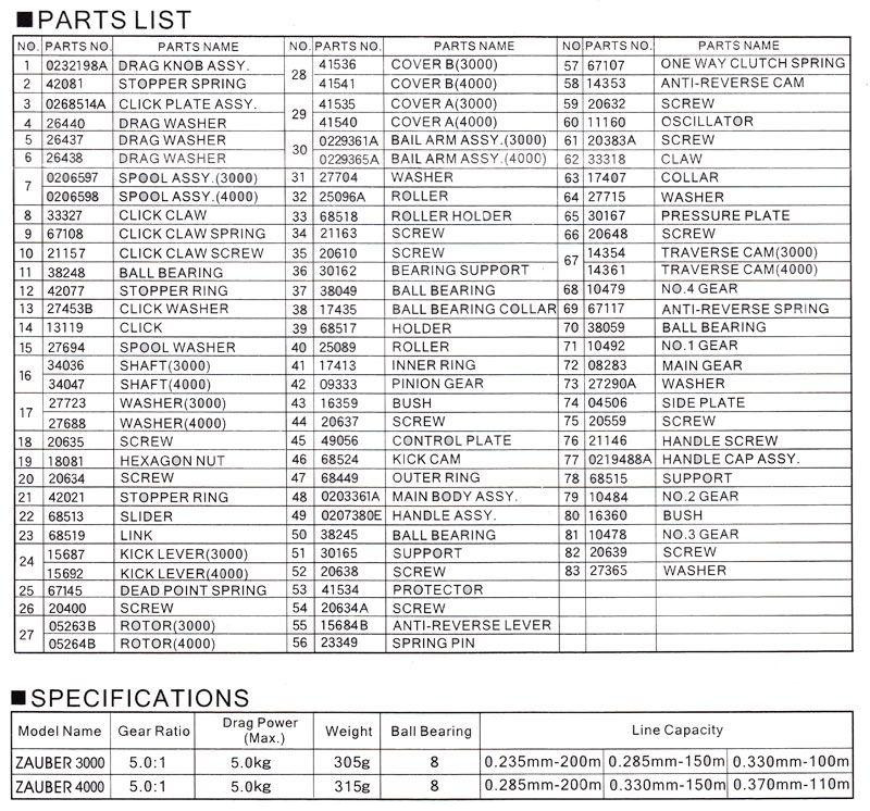 Одними из первых безынерционных катушек, которые стали очень популярными среди отечественных спиннингистов, были катушки из серии Zauber от компании Ryobi . Четыре модели, входящие в эту линейку, отличаются сравнительно небольшой массой (от 280 до 315 гр) и обладают передаточным числом равным 5.0 или 5.1:1. Надежность корпусу и основным деталям придает применяемый при производстве металл. Но самое главное - Zauber отличается плотной и ровной укладкой шнура, что достигается за счет использования механизма с "бесконечным" винтом и системой замедленной осцилляции. Добавим сюда установку 8 подшипников, обеспечивающих мягкий ход. Все это сделало данную серию чрезвычайно известной у рыболовов. Металлическая шпуля облегчена за счет перфорации и имеет бортик с покрытием из твердого сплава. Лесоемкость (зависит от модели) составит 65-200 м лески 0,285 мм. Фрикцион передний, с эластичной прокладкой, предотвращающей попадание воды. Максимальные нагрузки для тормоза составляют 2.5 или 5 кг.